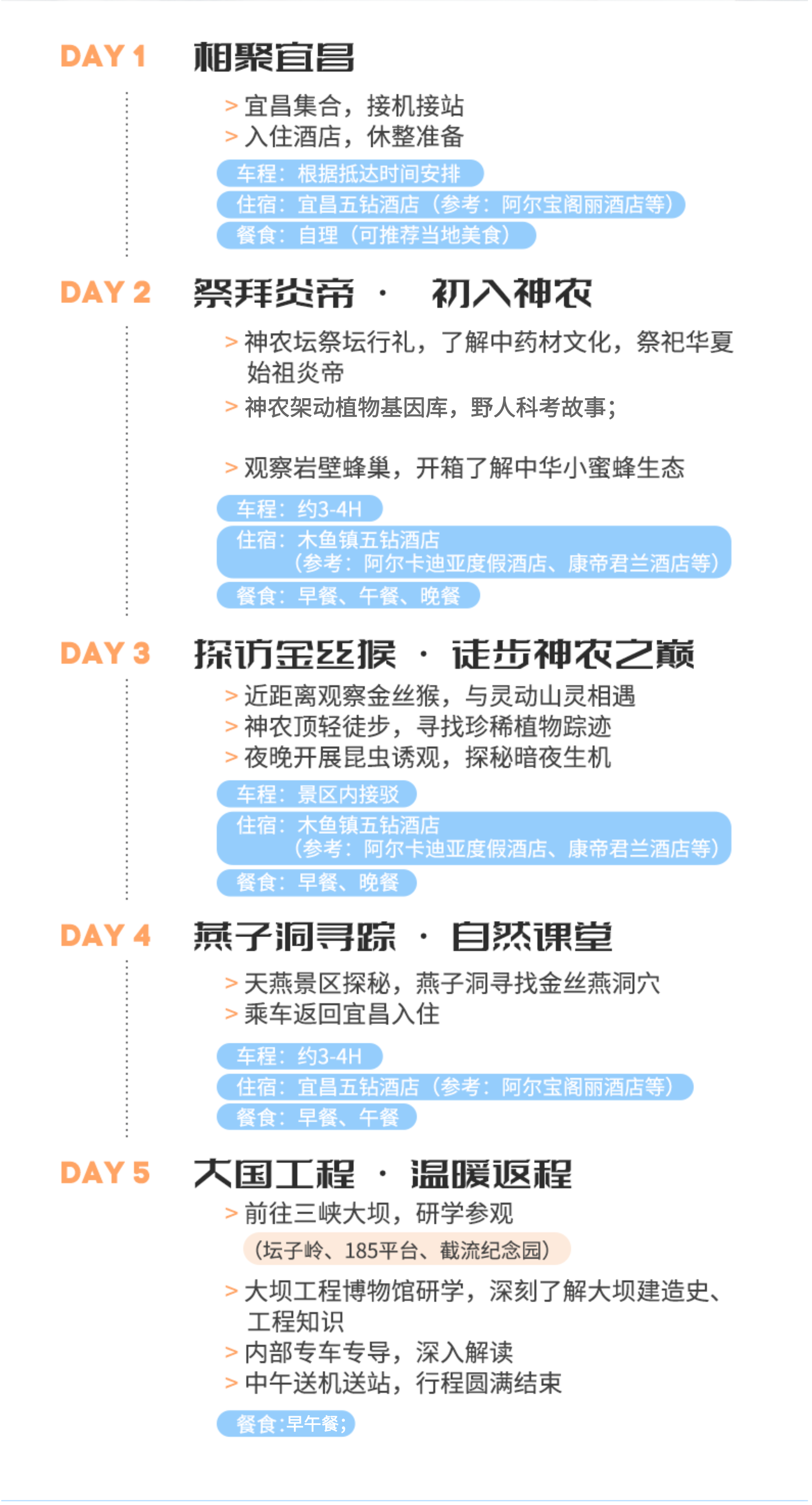 返程航班建议:最后一天抵达宜昌市的解散时间约14:30左右,建议购买16:00以后起飞的宜昌市【宜昌三峡机场】航班或15点后的宜昌东站车次和15:30后的宜昌北站车次;若您不赶时间,也可以在宜昌提前预定一晚住宿,次日返程或继续新的旅行。
