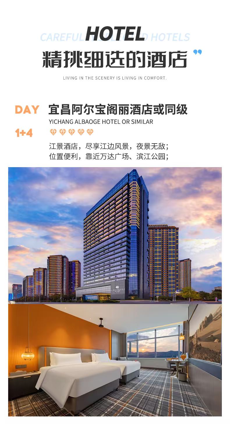 住宿:宜昌五钻酒店,参考阿尔宝阁丽酒店、恒大酒店等;