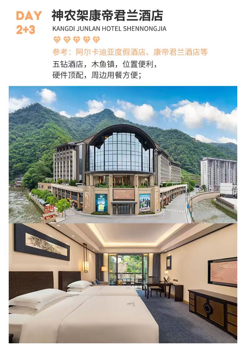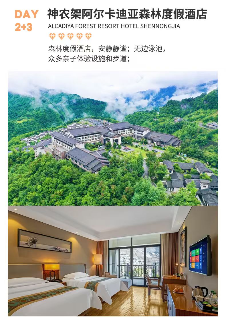 全程升级为5钻住宿标准:酒店精挑细选,住在风景与舒适里。神农架2晚连住当地TOP度假酒店,不折腾不搬家,老母亲太省力了~悄悄说一句,旺季住宿都能值回本!